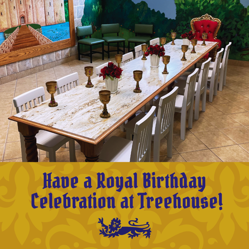 Please note: Due to COVID concerns, individual cupcakes or treat bags are allowed currently in the Party Room and party size is limited. Treehouse does not allow balloons, pinatas, or lit candles at any time. Party guests must be supervised all through the party time by the adults with the group. The Royal Party Room is limited to 18 total occupants.