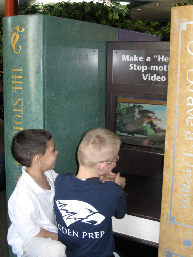 Make a stop motion movie using figures, props, and backgrounds to tell your story. Once it’s completed you can opt to receive a code to receive a copy of your movie at home.